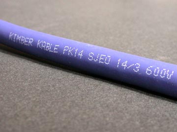 | キンバーケーブルは米国のケーブルブランドだ。昔はクロスオーバーという商社が輸入していたが、数年前にデノンラボが輸入元になった。たしか2000年頃だったか。オーディオアクセサリー好きなら、キンバーケーブルを知らない人はいないだろう。KIMBER KABLE PK-14はキンバーの定番電源ケーブル。PK-14の正式名称はPowerKord Model14。価格は実売2万円弱と手頃。キンバーの特徴は芯線同士を複雑に編み組みしたブレイド構造だ。これでノンシールドながらノイズ成分をキャンセルできると言う。ホット線とコールド線をツイストさせて電磁界をキャンセルする手法は古くから存在していたが、多数の芯線を複雑に編み組みさせたのはキンバーが初めてだろう。ただ、同社の資料によると、電源ケーブルにはブレイド構造を有しているかどうか記載はない。どうやら、電源ケーブルにはブレイド構造を採用しておらず、単純な3芯ツイストのようである。ケーブルを引き裂いて中身を確認したわけではないのだが。