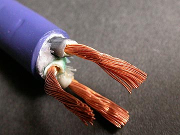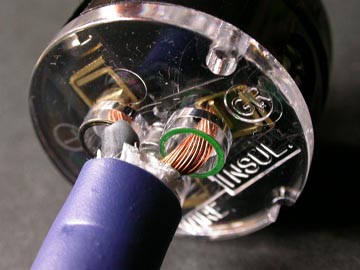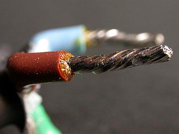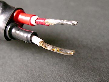 | さらにプラグ本体を取り外すと、ケーブル導体がむき出しになる。導体は撚り線で、端末はほどけないようハンダで固められている。 | |