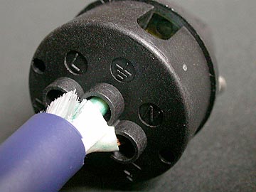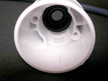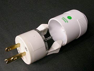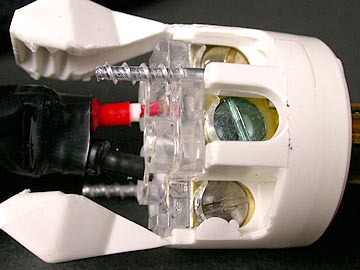 | ZEROに装着されている米国のブライアント製ACプラグ。カバーと本体はネジ2本で固定。カバー側は単純な構造で、ケーブルを締め付け固定するための機構は無い。私が知る限り、ZEROの電源プラグは初代ZEROに使われているブライアント製の白いプラグ、次代がブライアント製の黒いプラグ、さらにマリンコ5266を使ったバージョンも存在したと記憶している。IECプラグもバージョンアップにともない、フルテックからマリンコ320に変更されたりしている。 | |