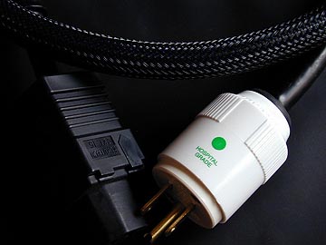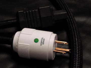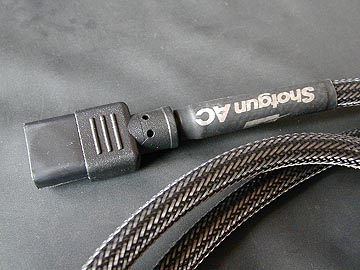 | ShotgunAC1のIECコネクター。ケーブルとの一体成形になっている。上級のマグナムやオラクルではマリンコ320が装着されている。右上はShotgunAC1の電源プラグで、レビトン5266が使われている。 | |