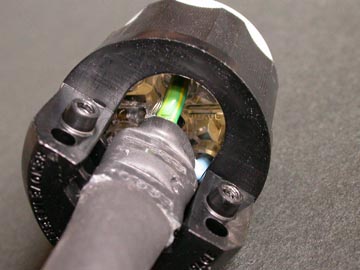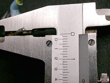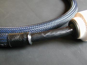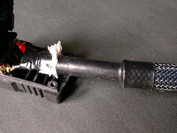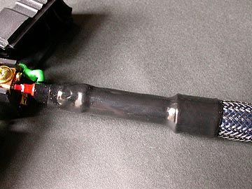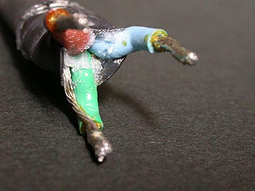 | 撚り線なので正確ではないが、導体の直径はφ2.0ほど。つまり、3スケアということか。右上の写真を見ると芯線の合間には、固まったボンドのようなものが付着しているのが分かる。これから察するに、端末の収縮チューブは内側にホットメルト式ボンドが塗布されたタイプのようだ。なお、グランド線にはシールドのドレイン線が合流しているのが見える。 | |