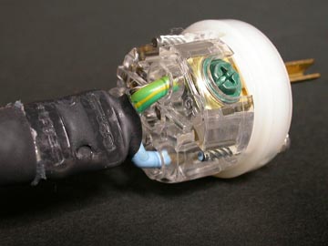 | 左上はACプラグとケーブルの接続部分。ケーブルは外装シースを剥いて線径を細くし、収縮チューブを被覆した上でプラグに挿入されている。右上はプラグケースを外したところ。ホットとコールドのみが配線されており、グランドは未接続となっている。 | |