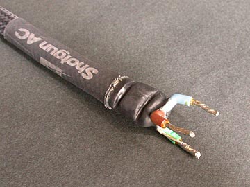 | プラグ本体を取り外すと導体がむき出しになる。ホット/コールド/グランドが各1芯の計3芯で構成されている。高純度銅を使用しているらしいが、正確な純度までは不明。芯線と外装シースの隙間にはナイロン繊維のような充填材が詰められている。導体は14ゲージ=φ1.9ある。PK-14の14とは、このケーブルの導体が14AWGだからだ。右上はIECプラグの接続状態。 | |