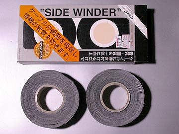 | サイドワインダーはセイシンが発売するケーブル被服材。ダイニーマと呼ばれるポリエチレン系特殊合成繊維を主材としている。ダイニーマは吸音材ミスティックホワイトにも使われている素材。ケーブルに巻き付ける事で、ケーブルに伝わる振動を強力に排除し、音が鮮明になるという効果があるらしい。ケーブルへの巻き付けは簡単だ。粘着式ではないため、かえって被服作業がやりやすい。粘着式のケーブル被服材は、ケーブルの柔軟性を妨げたりするので使いにくいのだ。ほどけないように端末をテフロンテープでとめてやる。1.5mのケーブルだと、その倍、つまり3mほどのサイドワインダーが必要となる。サイドワインダーは昔、オーディオ店でよく見かけたものだが、最近は取扱店が少なくなっている。すでに絶版になったのではないかと思われる。私もエンゼルポケットで在庫処分されていた最後の1箱を購入した。 | |
