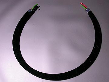 | 銅平網シールドチューブを被せたところ。このシールドチューブはアーシングチューブという名前でも呼ばれる事がある。このシールドチューブは店頭で売られている時には、平たい状態なのだが、これを平たいまま、工場設備のアース配線に使ったりすることもあるようなのだ。