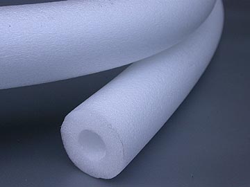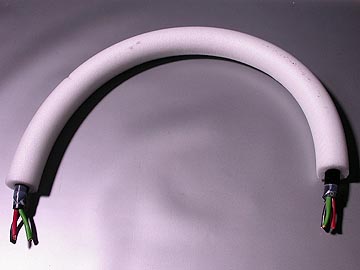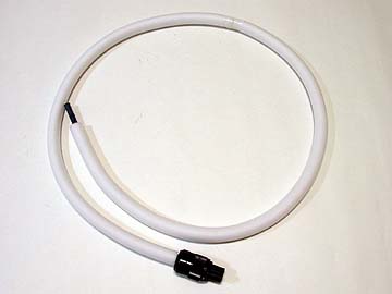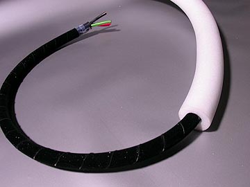| サイドワインダーを巻き付けたケーブルをカブセールという衝撃吸収チューブに通す。カブセールには穴が空いているので、そこにケーブルを通すのだ。カブセールはもともと給水パイプなどのパイプ部分や家具などのパイプに被服するための保温/緩衝材。オーディオ用の素材ではない。カブセールは高密度発砲ポリエチレン系の中空チューブで、様々な口径が存在する。東急ハンズには1mと2m長のカブセールが売られている。写真中で私が使っているカブセールは内径13/外径33のものだ。内径13だが、実際にはφ15ほど。
