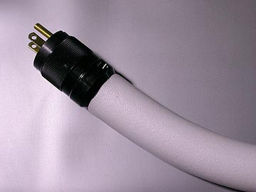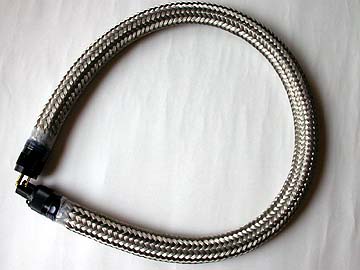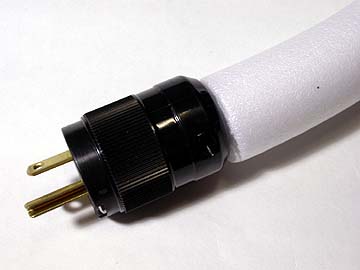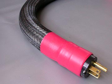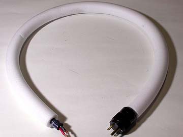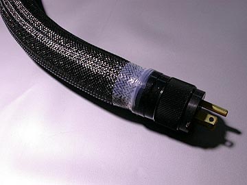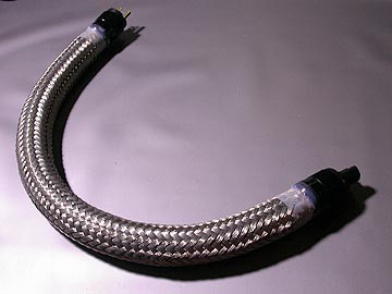 | なんとも異様な姿をしている電源ケーブルだ。ケーブル径はφ35ほど。ケーブル長は約1.5m。ナイロンメッシュは施してあるものの、ノンシールド仕様となっている。分厚い耐衝撃チューブを被覆してあるため、床からの振動にめっぽう強く、ケーブル自体にはほとんど振動が伝わらないようになっている。2005年6月に製作。 | |
