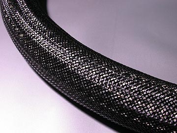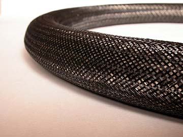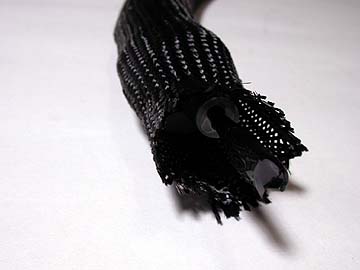 | 次にメッシュチューブを被せるのだが、ここではナイロンメッシュチューブを使う事にした。ポリエステルメッシュチューブの台頭によって下火になったナイロンメッシュチューブだが、使いようによってはなかなか良い。一般的なポリエステルメッシュチューブ(SFチューブやFLチューブ)ではメッシュの隙間から下の材質が見えてしまう。カブセールの白い表面が見えてしまうのは、見た目にかっこよくないので、今回は下地の透けないナイロンメッシュを選んだのだ。ナイロンメッシュはポリエステルメッシュに比べ耐久性がやや劣るのだが、そんなに荒く扱うものでもないし、オーディオ用電源ケーブルに使う分にはなんら問題はない。ナイロンメッシュはケーブルに馴染みやすく、伸縮性も良く、独特の光沢が美しいと言うメリットもある。扱いはポリエステルメッシュに比べ構成繊維が細いため、突起などに繊維が引っかかりやすく、やや被せにくい。銅網組チューブの上に被服しようとすると、ほぐれた銅線に引っかかったりする。 | |