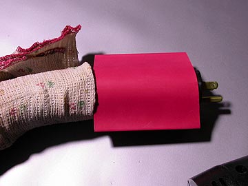 収縮チューブを熱収縮させる際は、ケーブル部分に濡れたタオルなどを巻き付けた上で、ヒートガンで熱風を吹き付ける。なぜ、濡れたタオルを巻き付けるかと言うと、熱風でポリエステルメッシュチューブが溶け出さないようにするためだ。ヒートガンからの熱風は裕に100度以上あるので、ポリエステルメッシュチューブにこの熱風が長時間あたると溶けてしまうのだ。 |