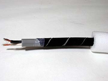 | ケーブルには富士電線VCT3.5を使用。これは先の電源ケーブル一斉試聴で使用したものだ。VCT3.5はその低価格とは裏腹に、はつらつとした元気のよさが特徴。ケーブルが柔らかいためか、定位が少し甘いところもある。今回のケーブル被服対策は、その弱点を改善する事を主目的としている。ケーブルにはまず、サイドワインダーという防振テープを巻き付けてやる。 | |