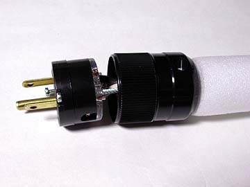 | ケーブルの片側、ここではワッタゲート5266iを先に取り付けている。カブセールはプラグ側にきっちり寄せておく。次いでカブセールを押し込んで、もう片側のケーブル端末をできるだけ引っ張りだす。そして、コネクターをしっかりネジ止めする。コネクター取り付け後、カブセールを押し込んでいた手を離すと、カブセールは元通りの長さに戻る。なお、左写真のように、ケーブルの端末はブチルゴムテープなどを巻き付けて、少し太くしてある。これはなぜかと言うと、ワッタゲート系のプラグコネクターのケーブル引き出し口の真ん中からケーブルを引き出すための補正加工なのだ。うー、ちょっと文章で説明するのが難しいなぁ。要は、φ13程度のケーブルをそのままワッタ/マリンコ系フルテックFI-25、オヤイデP-037系のプラグコネクターに固定すると、プラグの中心からずれた状態でケーブルが引き出されてしまうのだ。それを補正するためには、ケーブル端末をご覧のように太くすれば良い。これらのプラグコネクターには、細いケーブルを固定するための補正パーツが組み込まれていたりもするのだが、これはあまり立たないのだ。こういう補正のめんどくささがなく、ケーブルを常に引き出し口の中心から引き出せるプラグコネクターとしては、明工社ME2591/松下WF5018/フルテックFI-11系/AETPSE-018系がある。ま、これも万能とは言えないのだが。 | |