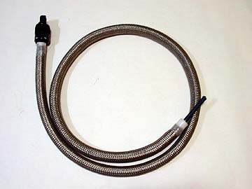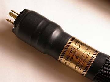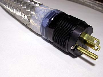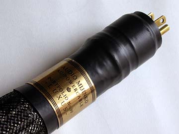 | こちらケーブルのアップ。メッシュチューブからシールドチューブが透けて見えるのがメタリックな感じでなかなかかっこ良い。右はプラグ/コネクターのアップ。マリンコ/ワッタ系のケース外径はφ38あるのだが、ケーブル自体もほぼ同じ径に仕上がっているので、なんとも異様なケーブルに仕上がっている。 | |