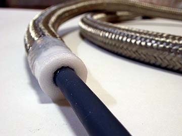 | こちらはカブセールを貫通するケーブルの状態。銅平網組メッシュチューブの端末はほどけないようにテフロンテープでとめてある。右上はコネクター側の様子。この後、さらにポリエステルメッシュチューブ(SFチューブφ19)を被せる。 | |