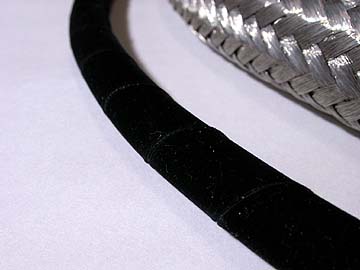 | 6N-P4030にダイニーマ繊維のサイドワインダーを巻き付けた状態。この状態でφ13ほど。右はカブセールにケーブルを通したところ。カブセールの内径は公称φ13ほど、実際にはφ13〜15程度。ケーブルはぎりぎりぴったり差し込めた。 | |