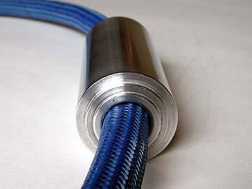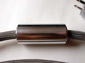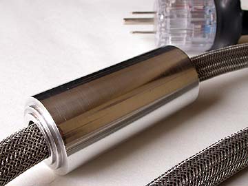 | この電源ケーブルの実験的要素はこのアルミの塊にある。ちょうどケーブルの中程のところに据え付けられている。このアルミの塊はアルミ棒からの削り出し。金属素材を売っているお店で見つけ、ケーブルを通すのにちょうど良い穴が開いているため購入した。これを耐水ペーパーで研磨し、コンパウンドで丹念に磨き上げると、ご覧のようなピカピカの状態になった。ケーブルへの収まりもちょうど良い感じだ。なぜにこのような塊を取り付けたかというと、ケーブルの振動排除を目的としている。ケーブルの中間辺りに重量付加を加える手法は、様々なケーブルメーカーでおこなわれていることであり、別に珍しい事ではない。ただ、自作ケーブルでは適当な部材の入手が難しいため、あまりおこなわれていないようだ。私自身、ケーブルへの重量付加が効果的だということを度々耳にしていたので、やってはみたかった。ただ、なかなか適当なパーツが見当たらなかったため、いままで実践する事は無かった。今回、このケーブルでケーブルへの質量付加を初めて挑戦する。 | |