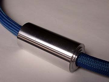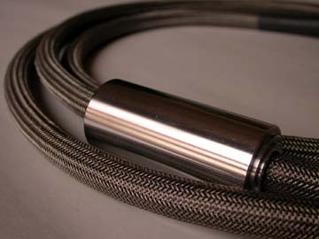 | ケーブル長は2m。電源ボックスとCDPとの長さに合わせ、少々長めに製作してみた。CV-S3.5に日本ジッパーチュービングのシールドメッシュチューブを被せている。CV-Sそのものには頑丈な銅箔シールドがなされているので、その上からさらにシールドをかける必要はないのだが、これは外見上の見栄えを良くするためである。副次的にはプリエステルメッシュチューブと同様に、外部振動からの緩衝作用を狙うという意図もある。ご覧の通り、メタリックに輝く奇麗な仕上がりとなった。 | |