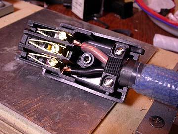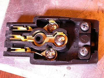 | 実はヤマテのコネクターを使うのはこれが初めてである。中身をあけるとこのような感じになっていた。導体金属は真鍮で、アース配線もきちんとおこなえるような構造になっている。シェルター系コネクターではアース側配線がケース締め付けネジと干渉して配線しづらいので、その点ではヤマテの方が構造的に有利である。ただ、ケーブルの固定ネジと金具の空間的余裕が少ないため、極太導線の固定にはやや不利である。普通のφ0.37ほどの細い撚り線なら固定もしやすいのだが、今回は単線なみの硬さの3.5スケア線を固定しなければならない。結局、耐久性を考慮して、ネジ留め固定の後に、接触部分をハンダ付けで補強してやる事にした。ハンダ付け後、これら接合部部にはケイグを塗って酸化防止してある。 | |