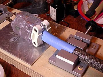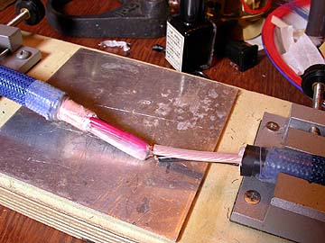 | ケーブルにメッシュチューブを被せたところ。メッシュがずれたりしないよう、メッシュチューブをよくしごいた上で、端末にテフロンチューブを巻き付けてやる。右はコネクター側ケーブル端末にコネクターの導体金具をハンダ付け固定しているところ。シェルター系コネクターはケーブル導体の締め付け強度が弱く、長期的な安全性に不安があるため、ご覧の通りハンダ付けで固定してしまった方が良い。必ずそうしなければならないわけではないのだが、ハンダ付けしたほうが良いと思うのだ。 | |