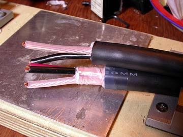 | こちらはコネクター部分の状態。コネクター全体とケーブル側5cmほどにかけてニシチューブの収縮チューブを被覆している。ニシチューブはスミチューブFに比べ厚みと光沢がある。電気絶縁性はスミチューブの方が高いらしいが、機械的強度はニシチューブの方が上らしい。右は制作過程の写真で、CV-Sの端末処理の状態である。両端末はそれぞれ、プラグコ/ネクターとの現物合わせで被服の除去範囲を決める。この作例で言うと、おおよそプラグ側は3cmくらい、コネクター側は3.5cmくらい被服除去をしてやるとよい。2本映っているケーブル端末の下側の方が、プラグへ装着する側。被服除去が外装ジャケットだけを剥いた1cmほどのところと、芯線をむき出しにしたところの、2段階に分かれているのが見て取れると思う。これは前述の松下系/明工社系プラグへのケーブル固定のための処理方法だ。 | |