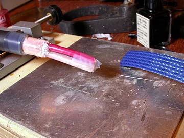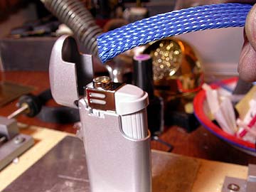 | ケーブルに被服するためのポリエステルメッシュ処理の一端をお見せしよう。ポリエステルメッシュ、ここではシャークワイヤーのカラーメッシュを使っているが、メッシュチューブの切り口は作業中にばらばらとほどけてくるのが厄介だ。これを防止するには、切り口にテープを貼付けておいてほどけなくするか、ご覧のように切り口をライターであぶるのが有効。ライターの火で切り口をあぶると、繊維同士が溶けて融着し、ほどけづらくなる。さっと軽くあぶるのがコツで、あぶり過ぎるとメッシュに火が着いて黒い煙を上げながら燃え始めてしまう。メッシュチューブをケーブルに通す時には、ケーブルの先端がメッシュの網に引っかからないようテフロンテープ等でまとめておくと良い。 | |