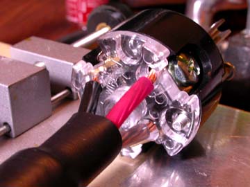 | ケーブル端末を固定し終えたコネクターの内部状態。シェルター系コネクターにケーブルを繋げる場合、ケーブル被服をどこまで剥くかなどを調べるために、必ず現物合わせで確認した方が良い。右はプラグ側の接合状況。アース配線(この作例では赤)も一応接続しておいたが、これは別に配線しなくても構わない。余談だが、CV-Sのように赤黒白の3芯を有する場合、どれをホット(H)コールド(WまたはNで表される)アース(G)に使うか疑問を抱く人も多いだろう。白をコールドに配線するのはほぼどのケーブルでも共通の事項。ただ、黒と赤のどちらをホットに配線すればいいかで迷う方が多いと思う。私もその一人である。電源配線の場合、基本的には黒がホットである。こうなると、必然的に赤がグランド配線に使われる事になる。しかしながら、赤をホット、黒をグランドに配線しているケーブルメーカーもあり、現実にはきちんと統一されているわけではないようである。