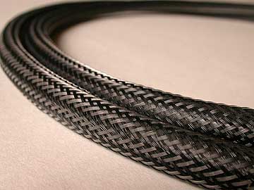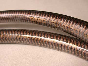 | さて、今回のお題であるAC-4000に話を戻そう。AC-4000はごくオーソドックスな2芯キャプタイヤ構造にメッシュと透明PVCシースを被覆している。絶縁材、仲介材ともにPVC。金属製シールドは見当たらない。には電磁波吸収膜があると表記されているのだが、この黒茶のナイロンメッシュらしき黒茶メッシュが電磁波吸収膜なのだろうか。端末処理してみても、この黒茶メッシュ以外には特にシールドらしいものは見当たらないのだ。時流からすると、絶縁体にはPVC以外のものを採用すべきではなかったか。導体はφ0.26×37本の撚り線で、導体断面積は2スケア。線材は高純度銅とある。ケーブル外径はφ12。太くもなく細くもなく、中堅どころだ。ケーブルは柔らかい。これは内部構造にPVCを多用したからだ。 | |