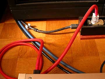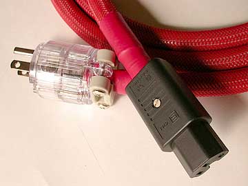 | 写真のVCTケーブルはデンカエレクトロンの赤メッシュを被せたもの。富士電線VCTは本来、先に紹介した写真のように灰色シースである。このVCTケーブルはスピーカーケーブルとして使用していたものなのだが、今回の試聴のために電源ケーブルに仕立て上げ直した。スピーカーケーブルとして使用していた時に装着していた赤メッシュを外すのも面倒なので、そのままにしておいた。プラグには松下WF5018とシューター4781を装着した。ともに電工用プラグ/コネクターだが、オーディオ用としても遜色ない。 | |