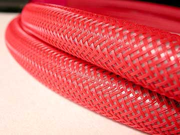 | 左上写真はVCTのノーマル状態と、私がシールドチューブを被せた状態のもの。素の状態は灰色のシースなのであしかあらず。良い写真がなくてすいません。下の写真も同様に、私がシールドチューブを被せたもので、実際にはノンシールドの灰色シースである。ケーブル外径はφ11.8。導体はφ0.32×45本撚り。VCT3.5m2と表記されてある通り、導体断面積は3.5スケアある。VCTにはこの他にも、1.25/2.0/5.5/8.0など様々な導体断面積のものがあり、芯線本数も2〜4本と様々。オーディオマニアの間では3.5と5.5の2芯タイプが多用されている。コネクターには松下5018とシューター4781を使用した。できれば、他の比較試聴ケーブルと同様、マリンコで統一したかったのだが、全ての試聴ケーブルにマリンコをあてがうと相当お金がかかるので、安上がりに済ませてしまった。 | |
