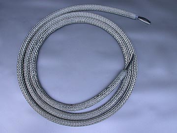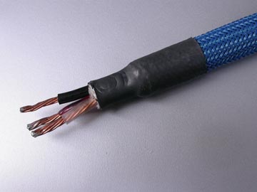 | 藤倉CV-Sの外装シースは艶消し黒なので、良く言えば渋い外見だが、悪く言えばが高級感に欠ける。そこでメッシュチューブを被せることにした。私のホームページではお馴染みのカラーメッシュチューブだ。これは台湾のオーディオアクセサリーメーカーであるシャークワイヤーの製品。当時、秋葉原での扱い店はなく、遠く大阪日本橋の河口無線に行って買い込んでおいたもの。なお、昨年末から秋葉原のタイガー無線でも扱うようになった。ただ、2005年2月時点でこの青メッシュ幅広タイプは輸入の滞りからタイガー無線に未入荷となっている。右上はハッベルの8215取り付け状態。このプラグのケーブル挿入口は狭いので、挿入口の部品の突起などを削り取ってみたが、やはりそのままではCV-Sケーブルが差し込みにくい。そこで、CV-Sケーブルを少し細めてやることにした。端末付近の外装シースと銅テープを剥ぎ取り、8φくらいにしてから収縮チューブにて被服保護し、9φほどに仕立ててやった。端末加工の甲斐あって、8215に無理なく差し込めた。 | |