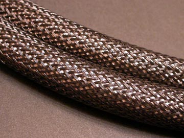 | メッシュチューブ、プラグ、コネクターともに黒で統一しているので、渋い見栄えに仕上がっている。SFチューブの下には銅平編線を被覆してある。このケーブルは中域の適度な張りと低域の弾力感を特徴としている。 | |