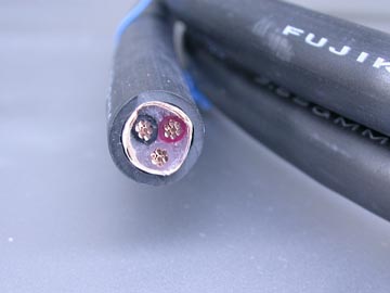| 藤倉CV-S3.5は電工用の電源ケーブル。CV-Sは電線メーカー各社から発売されており、メーカー毎にシールド材や充填材の種類が異なっている。その中でも私が知る限り一番良質なのは藤倉のCV-Sだ。ケーブル構造は質実剛健そのもの。導体は0.8φのタフピッチ線が7本束ねたもの。これに厚肉ポリオレフィン系絶縁を施し、強固な充填材で被い、その上からさらに厚肉の銅テープを巻いている。さらに頑丈な紙で締め上げ、最外装にはPVCのシースを被せている。このような構造と被服材を採用しているため、藤倉CV-Sはとても硬くて、取り回しがしにくい。ただ、全く曲がらないわけではない。音はストレート感強いもので、熱気をはらんだロック・ジャズ向きのケーブルといえる。使い始めの繊細さは今一歩だが、これもエージングとともに多少解消されてくる。¥400/mという価格が信じられないくらいお買い得な電源ケーブルだ。ハイCP電源ケーブルの最右翼的存在だ。 | |