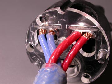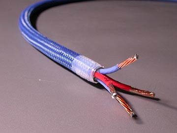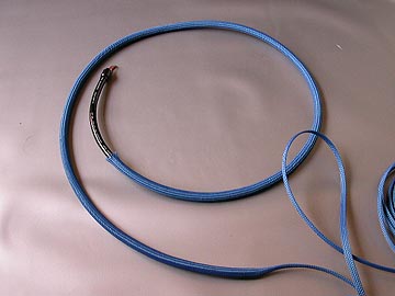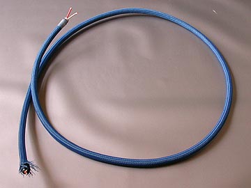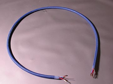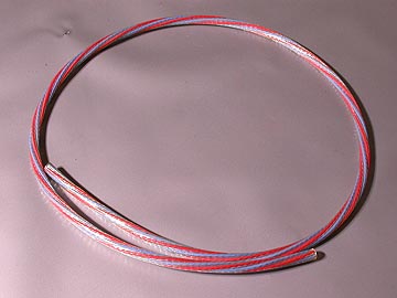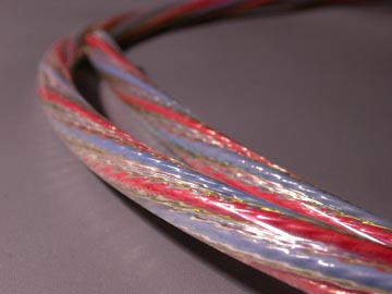 | 14-4CTの絶縁材はテフロンで、赤と青に色分けされたものが各2本の計4本。当然ながら、スターカッド構造に撚られている。シールドは無いが、S/Nに不満は無い。ケーブル径は10φと細いながらも、片側2芯なので導体断面積は3.5スケア以上あると思われる。あえていうなら、中域のメリハリが誇張される分、高域方向の繊細感が薄らぐ気もする。外装ジャケットは異例のほど硬い。硬いというより弾力があるゴムのようなものか。スーパーボールのような弾力感がある。14-4CTの作業上の難点はこの外装ジャケットを剥くところにある。新品の刃を装着したカッターで慎重に切れ目を入れながら少しづつ切れ目を広げていく。1mm弱の深さまで切れ込みを入れたら、切れ込み部分を中心に手で折り曲げる。そして、まだくっついている外装ジャケットをさらにカッターで慎重に切り込んでいく。一挙に剥ぎ取ろうとすると、必ずといっていいほど絶縁材にまで切れ込みが入ってしまう。私も何度か失敗している。ハンダコテなどに固定した高温のカッター刃で外装シースを溶かしながら切り取る方法もあるのだが、切り込む深さを間違えると絶縁材を傷つけてしまうので私はお勧めできない。 | |