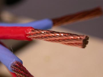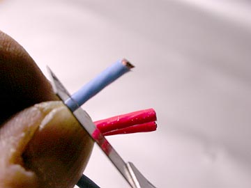 | 外装ジャケットの切り離しに成功したら後は簡単。絶縁材はカッターの刃をなぞらせれば簡単に剥ける。絶縁材が剥ぎ取り難い時には、ライター火で少しあぶってやると、スポッと取り除ける。絶縁材を剥ぎ取ると、普通の銅線より濃い色をした艶々の導体が現れる。 | |