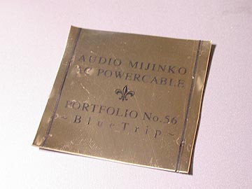 | 私は最近、自作アクセサリーにエンブレムを付けることにしている。作品としての命を吹き込むためだ。余談だが、私はミクストメディアのオブジェ創作をライフワークとしている。だから、私にとって自作オーディオアクセサリーとは音の出るオブジェなのだ。ま、こう考え始めたのは最近のことなのだが。エンブレムの製作には試行錯誤があったのだが、その1案としてパソコンでプリントした透明シートを金属シートに貼り付けて、これをケーブルに巻きつける方法を思いついた。まず、インクジェットプリンター用の片面粘着クリアーシートにエンブレムのデザインをプリント。よく乾いたら、これを片面粘着真鍮シートに貼り付ける。真鍮シートはホームセンターや東急ハンズのクラフトコーナーで売っている。 | |