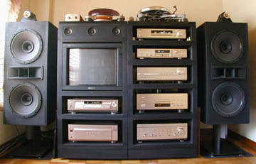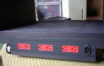 材料の都合から、今回は12台生産した。この電源ボックス、製造にかなりのコストと労力が掛かっているため、12台くらい作るのが限界だ。一番苦労したのはステンレス板の加工だ。コンセント部分のくり貫き加工はレーザーカット業者に委託したので、精度は抜群で全く問題なかった。ステンレスプレートに関して、私自身でおこなったのはネジ穴や表面の研磨作業だ。これがなかなかに大変だった。ステンレスは硬度が高いため、研磨作業も一筋縄ではいかない。しかも同じ板が12枚もある。相当な苦労の挙句、12枚分の加工を終え、さらにケース部分の組み立て作業、内部配線作業、振動対策を施して完成した。内部配線作業にも様々な労苦があった。12台の電源ボックスはいわば12つ子。それぞれ微妙に仕様が違うながらも、同じ時に生み出されたと言う事柄を示したいので、12台それぞれに土星の衛星名を割り振ることにした。よって、これらステンレスプレート電源ボックスをSaturnian Moons=土星の衛星と呼ぶことにする。 【経緯その1:JIS規格コンセント対応アルミプレート製ラック内臓電源ボックスの製作】 ちょっと時系列をさかのぼって、この電源ボックスを作るに至った経緯を述べよう。電源ボックスの製作記事を早くご覧になられたい方は、ここは飛ばし読みいただいて結構。 今から3年前の2002年夏、みじんこオーディオシステムが形となった。3ヶ月間の制作期間を要し、メインスピーカーPA-2と長岡式積み上げラックが完成したのだ。その後も、このオーディオシステムは微妙な変更を重ねているが、基本的なスタイルに変わりは無い。私のオーディオラックの特徴はラック最下段にある。ラック最下段は高さ12cm、奥行き45cm、幅60cmなのだが、ここには移動用のキャスターが四隅に付いている。前面は開閉式の蓋になっており、そこを開けると内幅36cm、内高6cm、奥行き35cmほどの空間が設けられている。ここにはスーパーアースリンクやコピーガードキャンセラーなどを収納している。背面は電源ボックスになっており、ここからラック内の各機器へ電力を分配している。 |