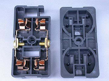 ただ、このコンセント、業務向けの流通商品なので、一般の小売店舗では見かけることはない。秋葉原のパーツ店にも置いていない。あえていうなら、7110GDの20A仕様となる7210GDなら、秋葉原の愛三電気と九州電気に置いてある。私はラジオストアー内の九州電気にお願いして、7110GDを50個ほどメーカーから取り寄せてもらった。7110GDを採用するに至った経緯にはオヤイデ電気の社員さんのお話がきっかけ。オヤイデの社員さんがオヤイデオリジナルのコンセントの製作を始めるにあたって、原型となるコンセントを探すことになったそうだ。国内で流通している様々な3Pコンセントをかき集めて比較試聴をおこなった結果、7110GDが群を抜いて良かったとのこと。SWO-DXは7110GDの電極にロジウムメッキを施し、さらにケースの樹脂に強化繊維を混入した強化モデルなのだ。SWO-DXは元気があって解像度も抜群なのだが、SWO特有の高域の「シャリッ」とした癖が耳について嫌だという人もいるだろう。そういう人には、むしろこの原型モデル7110GDの方がフラットな傾向で、高域のピークも無いので好ましいかもしれない。とはいっても、入手は困難だが。 コンセント固定手段は2パターン考えられる。一つはケース本体に固定する方法。この場合、コンセントをケースに固定してから、コンセントプレートを被せることになる。メーカー品の多くはケースに固定する方法を採用している。もう一つはコンセントプレートに固定する方法。この場合は、まずコンセントをプレートに固定し、これをケースに固定することになる。IECインレットをケースに取り付けている場合、前者のほうが内部配線がやりやすい。導通部分のパーツは全てケースに固定されているわけだから、全ての配線を済ませてから、プレートを被せればいい。ただ、前者の手法を採用した場合、ケースに固定したコンセントと上から被せるプレートとの噛み合わせの精度が問題となる。また、コンセントを固定する台座をケース内に設けなければならない。台座の高さも正確に揃っていないと、3つのコンセントが全く同じ高さに、しかも水平に固定できない。コンセントが歪んで取り付いてしまうと、プレートから均一の位置にコンセント口が突出してくれない。3個のコンセントがケースの正確な位置に固定できて、プレートをぴったり被せられればいいのだが、そうはなかなかいかない。メーカーのようにコンピューター制御で金属を削って、寸部違わずパーツが組み合わせるようになっていればいいのだが、自作の場合は半ば手作業で精度を追求せざるを得ない。特に、今回のケース部分は木材を使用する。木材カット業者のカット精度は完璧ではない。コンマ数ミリの誤差は必ず生じるので、組んだ木材ケースの完璧な精度を出すのは難しい。一旦加工してもらった板を手作業で修正するにも限界がある。そんなわけで、内部配線がやりにくいのを承知の上でプレート固定型を選んだ。この手法のメリットはプレートに正確な穴さえ開いていれば、コンセントが均一に取り付けられることにある。この場合、ケース部分に固定されたIECインレットとプレートに固定されたコンセントを橋渡しするように内部配線を固定しなければならないという作業上の難点が生じるのだが、内部配線を長めにしておけばなんとか固定できるはずだ。この方式を採用した理由は他にもあって、コンセントを3点ネジ留め固定したいという思惑が働いたからである。詳しいことは次に述べる。