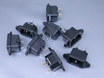 ここでは電源ボックスに使用する素材の中で、音質比較実験を予定しているIECインレット/内部配線材/配線方式についてご説明しよう。 【音質比較実験に用いるIECインレット】 まず、IECインレットについて。今回、8種のIECインレットを比較試聴実験することにした。秋葉原のパーツ屋を駆け巡って入手してきた。なお、IECインレットは3Pインレットとか3P型ACインレットという言い方もする。 |
