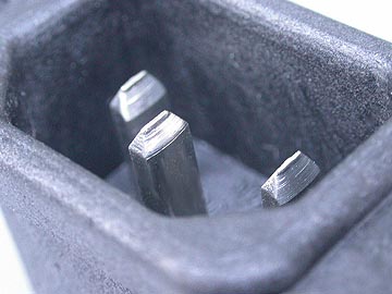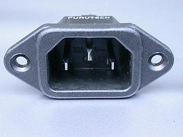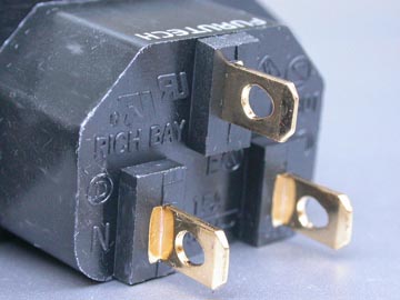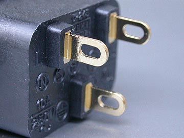 | フルテックINLET-GとINLET-Rの電極アップ。電極の幅は4mmと、一般的なインレットよりやや大きめ。表面の刻印のひとつ、URという文字をひっくりかえしたようなマークは、米国のUL規格の一種。 | |||||||||||||||||||||||||||||||||||||
