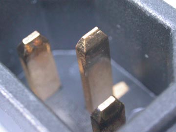 | 電極の様子。左上がニコオン。右上はオヤイデ。ニコオンNC174-10N-Cの方がメッキに艶がある。オヤイデIEC320 INLETは少しざらついている。 | |||||||||||||||||||||||||||||||||||||
