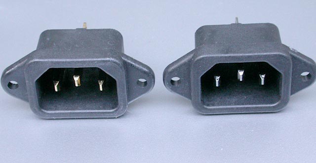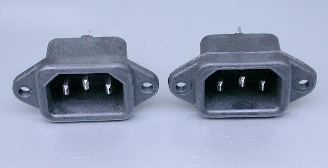 | 左上はニコオンNC174-10N-C。電極にはニッケルメッキ。\150/ケ。ケースは耐熱性樹脂で、グラスファイバーも混入されている。見た目は素っ気無いが、作業してみるとハンダの熱に強いため作業が安心して行える。実際、ケースはかなり頑丈で硬い。NC174-10N-Cは秋葉原のパーツ屋で容易に見つかる。私は秋葉原ラジオデパート3Fの門田無線電機で購入した。ニコオン(NICOON)はたしか関西の会社だったかなぁ。右はオヤイデIEC320 INLET。¥710/ケ。オヤイデ電気の製品だが、実はニコオンNC174-10N-Cが原形になっている。オヤイデIEC320INLETはこれにロジウムメッキを掛けたもの。メッキの違いで価格は8倍!ご覧の通り、両者はメッキ手法が違うだけで、外見上は見分けが付かない。 | |||||||||||||||||||||||||||||||||||||