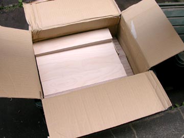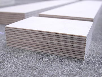 | 上写真はもくもくから届いたカット済みバーチ材。ご覧の通り、フィンランドバーチの断面はプライ数が多くて、緻密で綺麗だ。ちなみに、合板の英訳はplywoodで、ply=プライとは積層合板を構成する単板を指す。5プライといえば、5枚の単版を積層した合板、7プライなら単板が7枚積層された合板ということになる。一概には言えないが、同じ板厚なら、プライ数が多い方が密度も高く、良質なことが多い。従って、音響的にも有利となる。15mm厚の場合、一般的なラワン合板は5プライ、シナ合板は表層の極薄シナプライも含めて7プライが一般的だが、15mm厚フィンランドバーチは13プライ。なお、フィンランドバーチ材の表面には全域にわたり細かい傷がある。木目と90度違えて傷があるので少々気になる。これはバーチ材の製造時に平面性を出すために電動ヤスリで切削した痕だと思われるが、詳細は不明。ま、このヤスリ痕がバーチ材の証しというべきか。 | |||||||||||||