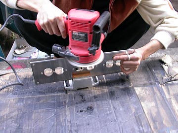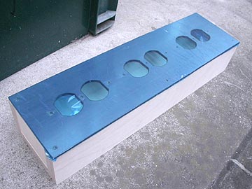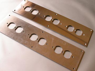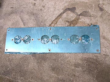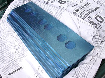 | 左上はレーザー加工業者でカットしてもらったステンレスプレート。表面保護用の青いシートが貼ってある。ULコンセント埋め込み用の6箇所のくり貫きはレーザーカットだが、ネジの取り付け穴は自分で開ける。ネジ穴個所はレーザーでポンチを打ってもらっているので、それに沿って穴を開けていく。右上はボール盤を使って穴を開けた後。ステンレスは硬度があるので一般的な軟鉄用ドリル刃では穴を開けられない。したがって、ステンレスを打ち抜くことが出来るチタンコーティングの超硬ドリル刃を用いている。ネジ穴の個所は計15箇所/枚。12枚もあるのでなかなか大変な作業だ。φ3.5のネジを通すので、穴の径はφ4にしてある。穴の位置がずれると取り返しがつかないので、一箇所一箇所慎重に位置決めをしてから穴開けする。