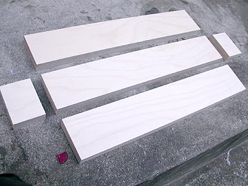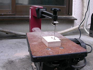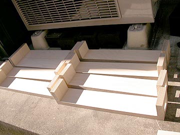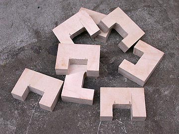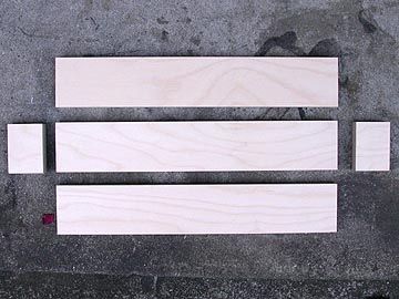 | これが切り抜いた板材。次は板材同士を木工ボンドで組み立てていく。まず、写真右上のように、小さい方の側面材を底板に接着する。乾いたら、さらに長い側板を接着する。 | |||||||||||||
