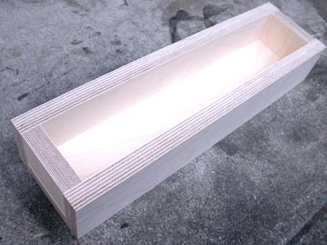 | なお、木工ボンドにはタイトボンドという速乾性強力ボンドを使用した。外国製で、クリーム色をしている。普通の速乾ボンドは乾きは早いが強度はいまいちなことがある。タイトボンドは速乾性でありながら接着強度も高い。タイトボンドは東急ハンズ各店で購入できる。 ボンドが完全に乾いたら、紙やすりで表面を整える。これにてケースの組み立ては完了。なお、板材の木口、つまりカット断面は素のままにしてある。シナテープによる木口処理をしてもよいのだが、フィンランドバーチの木口はプライが緻密で美しいため、わざわざ隠す必要はないと判断した。 | |||||||||||||