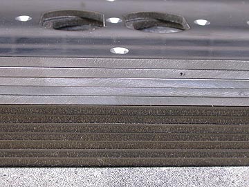 | ディスクグラインダーは強力だ。火花を飛び散らせながら、板の断面が研磨されてゆく。あっという間に断面の筋が削り取れた。写真右上を見て欲しい。下が研磨前の断面。上に重ねているのがグラインダー処理後の板。焦げと荒れが取り除かれている。ただ、この状態ではまだ不十分なので、さらに人力で断面を研磨していく。ディスクグラインダーの切削能力は強力だが、騒音も凄まじい。ギャーンーキューンという切削音が鳴り響くので、とても近所迷惑だ。私は住宅密集地に住んでいるので、こういう作業は日中にしかおこなえない。オーディオマニアの場合、オーディオを鳴らしていて近所から苦情を受けるというのはありえる話だと思うのだが、私の場合、オーディオを鳴らす装置作りで騒音苦情がくる。 | |||||||||||||