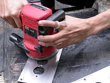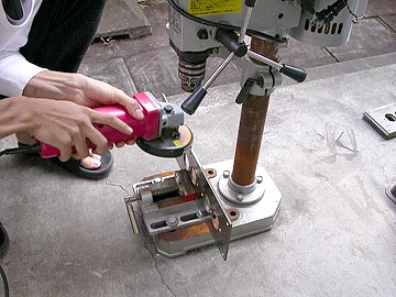 | 次に、切断面の研磨に入る。レーザーカットはNC旋盤と違い、切断面が綺麗とは言いがたい。レーザーが貫通した方向に焼き切った筋が入り、少し焦げた感じになる。今回の電源ボックスは断面が表に見える状態で固定するため、切断面を綺麗に研磨してやる方がいい。磨くといっても、相手はステンレス。硬い金属なので一筋縄では行かない。手でシコシコ磨いても断面は一向に綺麗にならない。だから、電動サンダーポリッシャーを使って研磨することにした。ポリッシャーで磨くことしばらく、なかなか筋が消えない。サンダーによる研磨は早々に諦め、ディスクグラインダーで荒削りすることにする。 | |||||||||||||