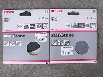 | 断面の荒削りが終わったら、次は表面の研磨だ。研磨にはサンダーポリッシャーを使う。左上は400番と1,200番のポリッシャー用フィニッシュペーパー。5枚入りで600円ほど。裏面がマジックテープ状になっており、ポリッシャーにマジックテープで固定する。400番で表面の傷やバリを削り取り、さらに1,200番で均す。これもかなり手間と時間の掛かる作業。表面とともに、ディスクサンダーで荒削りした板断面も研磨していく。400番と1,200番の間に、できれば600番あたりを掛けたかったのだが、600番のポリッシャー用ペーパーは店頭に置いてなかったので仕方ない。この行程だけで1枚あたり半時間は掛かっている。 | |||||||||||||