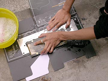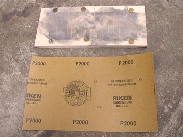 | 鏡面仕上げにするにはさらに細かいペーパーで研磨する。2,000番の耐水ペーパーを木の板に画鋲で固定し、せっけん水で濡らしながらステンレス板を研磨していく。これも根気のいる作業だ。 | |||||||||||||