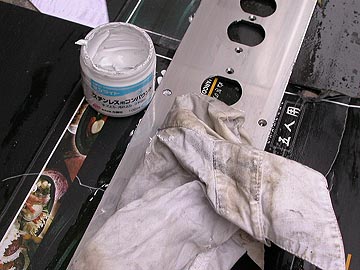 | 仕上げはコンパウンドを使う。使ったのはステンレス専用コンパウンド。何がどう専用なのか詳細は不明だが、専用と明記されるとこの方がいいのかなと思ってしまう。研磨粒子が違うのだろうか。ま、とにかくこのコンパウンドを使ってプレート表面をひたすら研ぎまくる。12枚全て磨き終えた後、ステンレスプレートを抱きかかえてお風呂に入る。風呂でコンパウンドを洗い流すのだ。綺麗に洗うと残っている傷もよく分かる。細かい傷は仕方ないので諦めるが、目立つ傷が見つかれば、再度ポリッシャー研磨行程からやり直す。 | |||||||||||||
