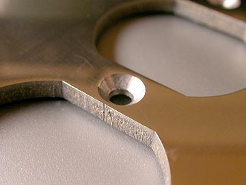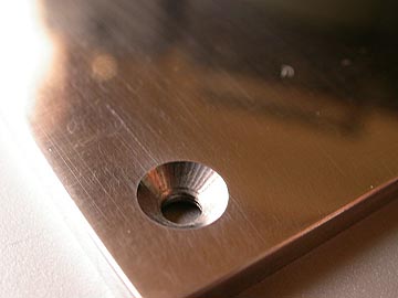 ネジ穴の状態。面取りの状態がよくわかる。プレート表面をよーく観察すると、取り去れていない傷が見受けられる。近づいて見ないと分からないくらいだが。硬質なSUS304を手作業で研磨するのは作業なので、ある程度の傷は納得するしかない。表面の研磨加工の精度については今後の課題としておこう。